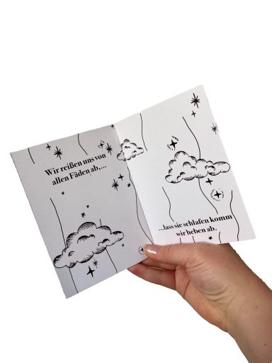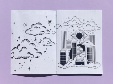 Im Rahmen des Editorial-Basiskurses habe ich ein Zine gestaltet, das das Lied „Lila Wolken“ von Materia inszeniert. Mein Ziel war es, die damit verbundenen Emotionen in einem reduzierten Schwarz-Weiß-Design zu visualisieren. Die Inhalte entstanden durch analoge Zeichnungen, die ich digital weiterverarbeitet und um feine Details ergänzt habe. Zusätzlich entwickelte ich einen passenden, faltbaren Umschlag.