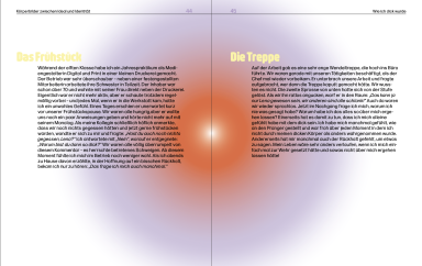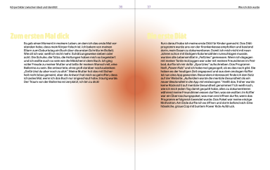 Meine Bachelorarbeit ist eine Publikation, die das Spannungsfeld zwischen gesellschaftlichen Schönheitsidealen und persönlicher Identität untersucht. Das Hardcover enthält zwei Buchblöcke: rechts die wissenschaftliche Auseinandersetzung mit Schönheitsnormen, Medienbildern und Körpern außerhalb gängiger Vorstellungen, links persönliche Geschichten und Erfahrungen, die mich als dicke Frau geprägt haben. Gestaltung, Typografie und Farbverläufe greifen die Themen von Emotion, Einfluss und Wandel visuell auf und verbinden wissenschaftliche Analyse mit künstlerischer Reflexion.
