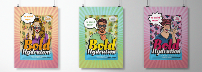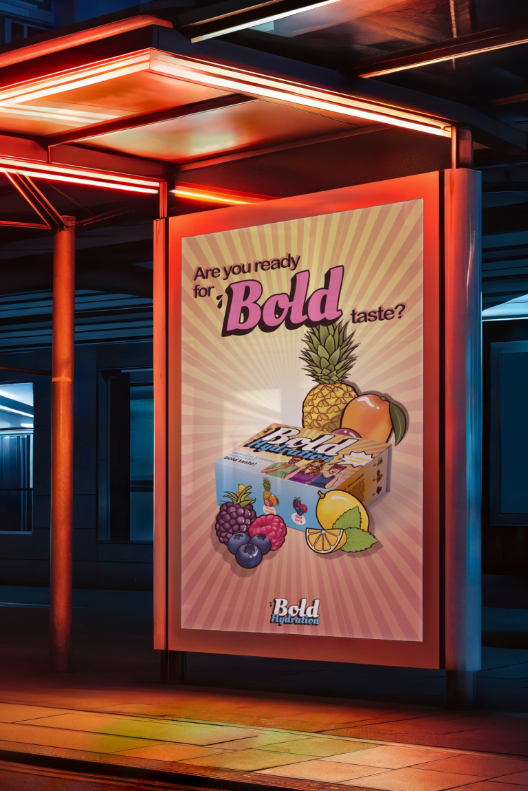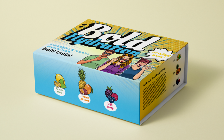 Für die Getränkemarke BOLD habe ich das Packaging Design entworfen. Auf Grundlage eines Moodboards entstand ein modernes Erscheinungsbild mit eigenen Illustrationen für die verschiedenen Flavors. Die Designs wurden mit Adobe Creative Cloud umgesetzt und als Mockups präsentiert. Die Charakterillustrationen stammen von einem Illustrator, die Fruchtillustrationen hingegen von mir. Es handelt sich um Konzept-Entwürfe, die nicht produziert wurden.